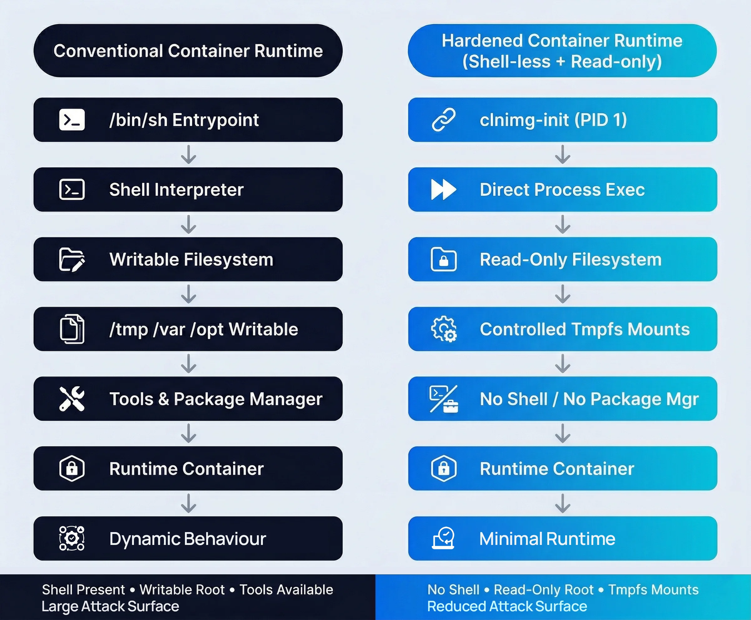 Removing the shell reduces the number of tools available at runtime, but it does not prevent modification of the container contents. To address this, CleanStart enforces an immutable root filesystem by mounting it as read-only in production images.