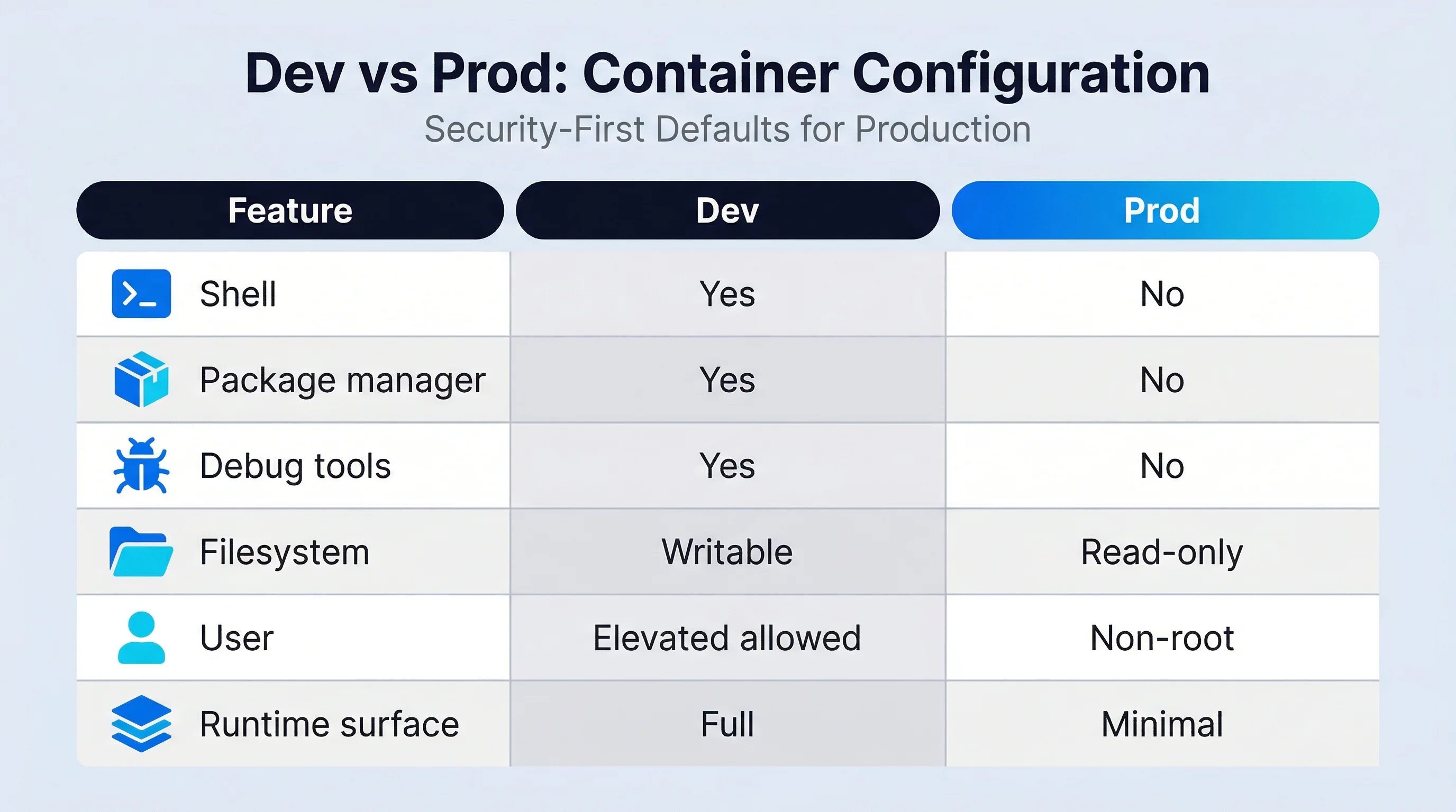 This ensures that application behavior remains consistent across environments while preventing unnecessary utilities and writable components from reaching production.