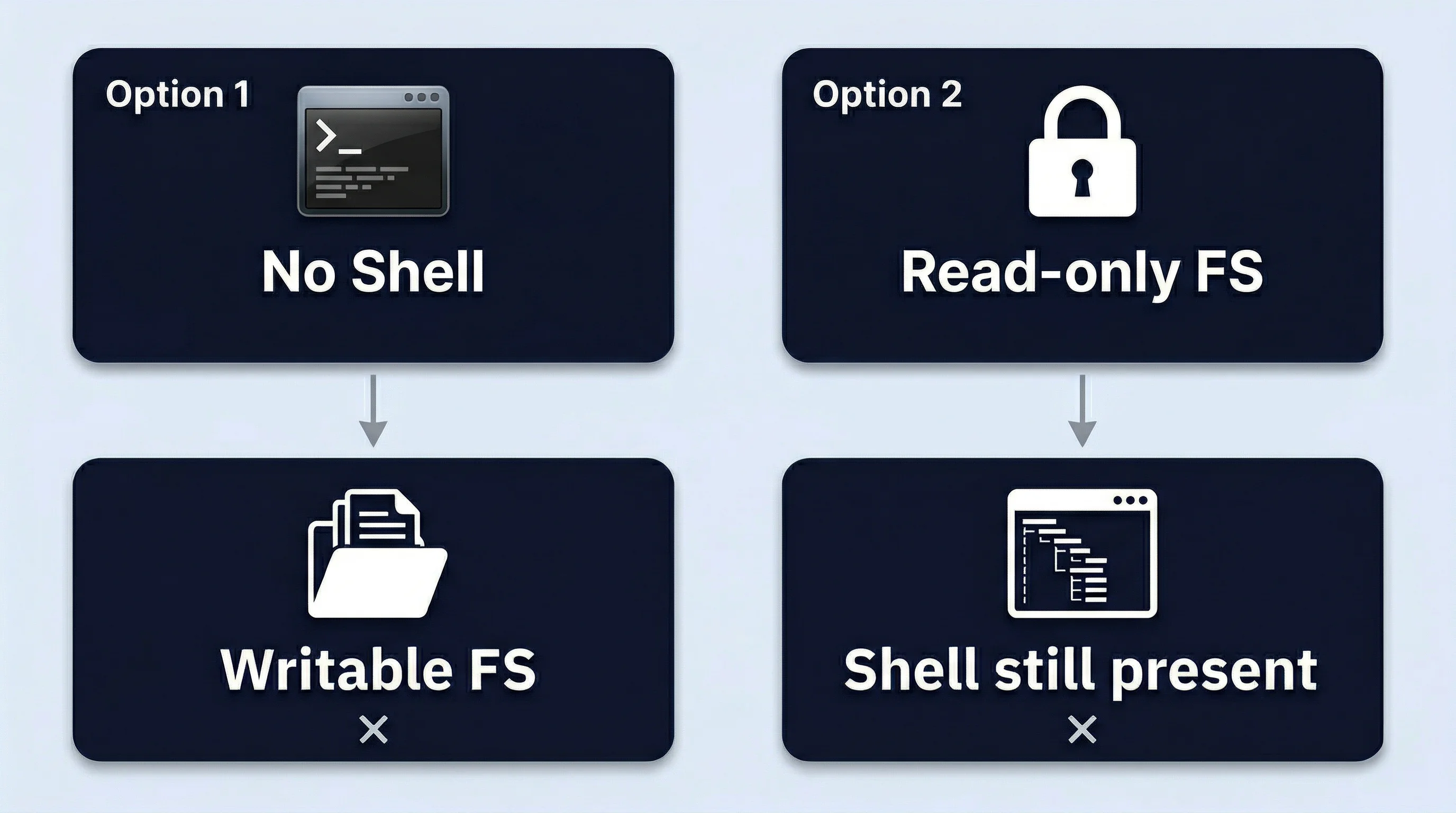 As a result, most production images retain at least one of these capabilities. If the shell is removed, the filesystem is usually left writable. If the filesystem is made read-only, the shell is often kept for initialization and debugging. This creates an unavoidable tradeoff between usability and security.
