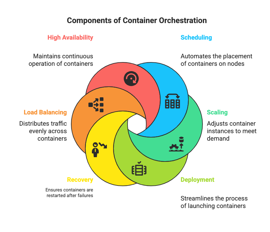 A container orchestration system is made up of several core building blocks that work together to deploy and manage workloads reliably at scale.