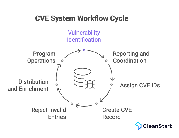 The CVE system works as a standardized workflow for turning a publicly disclosed security issue into a shared identifier and record that security teams and security tools can track across advisories, scanners, and databases.