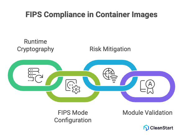 - Container images often ship the cryptographic libraries used at runtime. If those libraries are not FIPS 140-2 validated or FIPS 140-3 validated, the workload cannot credibly claim it uses validated cryptography in regulated environments, and the container entrypoint must explicitly start the application in FIPS mode and fail fast if the validated module or required configuration is missing.