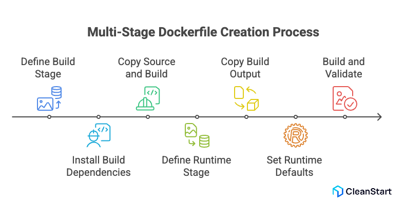 - Define the runtime stage: Choose a smaller runtime base image that can execute the artifact without the build toolchain. This separation is the core reason teams leverage multi-stage builds.